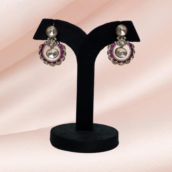 Add a splash of elegance to your look with these vibrant circular stud earrings. Featuring a stunning combination of ruby-hued accents and sparkling moissanite stones, this design beautifully blends tradition with contemporary flair. Perfect for festive occasions, weddings, or evening events.