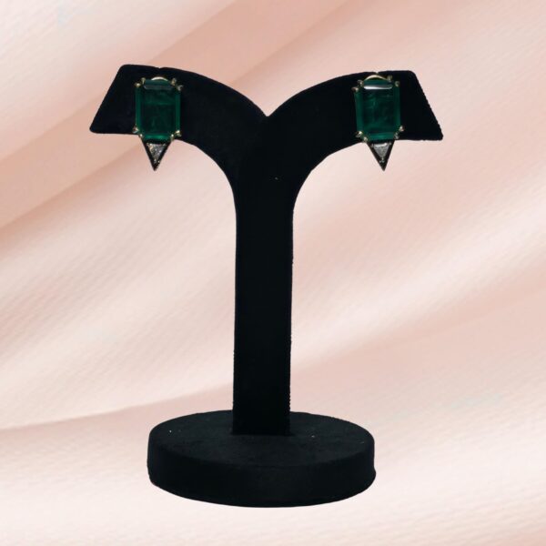 Elevate your elegance with these stunning emerald cut stud earrings featuring a deep green central stone paired with a unique downward-pointing diamond-shaped accent. Set in a sleek gold-tone frame, the minimalist yet bold design is perfect for both contemporary and traditional looks. Whether it’s a festive occasion or a formal evening, these earrings bring a touch of refined glamour to any outfit.